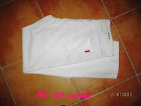 Como esta blusa ya es muy llamativa la suelo combinar con pantalón neutro, en este caso fue este vaquero blanco de verano, es muy fino y no da nada de calor, que compré en una tienda local y que está lleno de detalles como los bordados de los bolsillos traseros en forma de corazón.