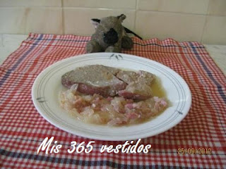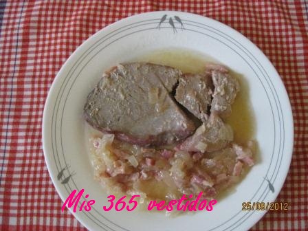 Ingredientes para dos personas: 2 lonchas de bonito de unos 200 o 250 gr cada una, 100 gr de bacon, una cebolla y 2 cucharadas de aceite de oliva.