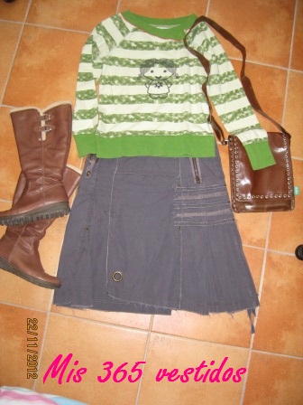 El conjunto como veis es muy sencillo, una falda gris con un jersey de rayas verdes y las botas planas marrones que además de ser muy calentitas son muy cómodas.