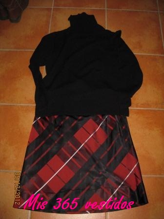 Llevo un jersey negro de cuello alto de hace ya muchas temporadas de la marca Yhocos; la falda es de Amitie y la compré en El Corte Inglés hace ya muchísimos años para la boda de una amiga, era larga hasta los pies pero mi madre me la cortó para poder utilizarla mucho más; las botas son de Tolino una marca de botas que las hace con tres anchos de caña diferentes; el bolso lo compré en Bimba y Lola la primera Navidad que estuvieron en Zaragoza; y como complementos el collar de calavera con lacito y el anillo, los dos son artesanos y los compré en distintos mercadillos, el collar es de este año mientras que el anillo es de hace ya varios veranos.