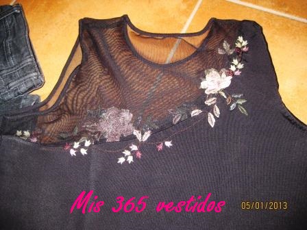 La camiseta me encanta porque creo que es sencilla pero a la vez un poco sexy, el efecto un hombro al aire que hace la parte transparente me encanta. Además de que el bordado de flores la anima muchísimo.