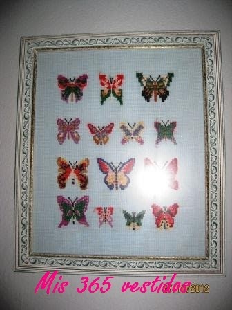 Hoy os enseño un cuadro que hice cuando era adolescente, los colores de las mariposas no eran los que puse, pero por lo que os comentaba de ahorrar un poco, utilicé restos de colores que tenía en casa. Que aparecía un rosa, pues yo utilicé uno que tenía; que el verde era pistacho y yo no tenía, pues utilicé verde botella...