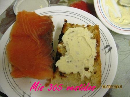 Y por último ponemos el salmón sobre el pan. Y ya podemos disfrutar de nuestra maravillosa cena.
